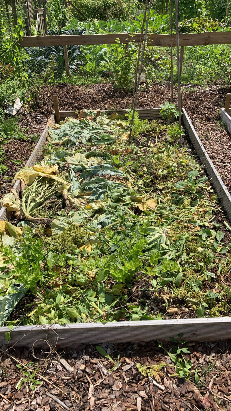 this bin has just been mulched. Here the bugs can do their work bacteria and fungi reform this plant waste and thus deliver their food to the vegetable garden.